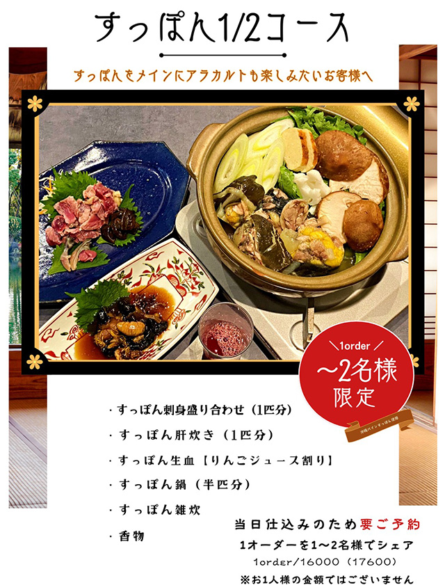※すっぽん一匹コースはランチタイム(要予約)にもご提供しております。食べログかお電話にてご予約をお願いいたします。